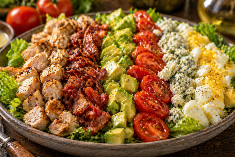 Кобб-салат — сытный вариант, который часто заказывают вместо основного блюда. Здесь всё про насыщенность: мясо, сыр, яйца и яркая заправка. Для приготовления понадобится: куриное филе — 200 г, бекон — 100 г, яйца — 3 шт., авокадо — 1 шт., помидоры — 200 г, сыр (например, с голубой плесенью или чеддер) — 100 г, салатные листья — 150 г, оливковое масло — 3 столовые ложки, лимонный сок — 1 столовая ложка, соль и перец — по вкусу. Куриное филе обжарьте или отварите, бекон подрумяньте, яйца отварите, затем все ингредиенты нарежьте и выложите рядами на листья салата, полейте заправкой из масла и лимонного сока.