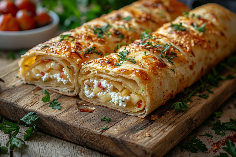 Выпекаю в разогретой до 180°C духовке 20-25 минут, пока лаваш не станет хрустящим и золотистым. Даю рулету полностью остыть на противне, затем нарезаю на порционные кусочки.