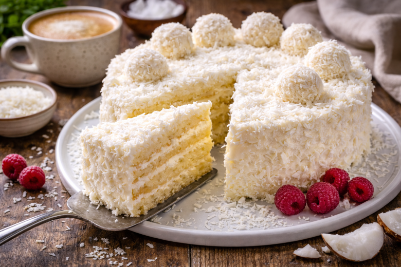 Этот десерт — находка, когда хочется чего-то сладкого, но без тяжести и лишних калорий. Торт получается очень нежным, буквально тает во рту, а по вкусу напоминает знаменитые кокосовые конфеты. При этом готовится проще, чем кажется: основа — из творога, без муки, а крем — лёгкий и воздушный.