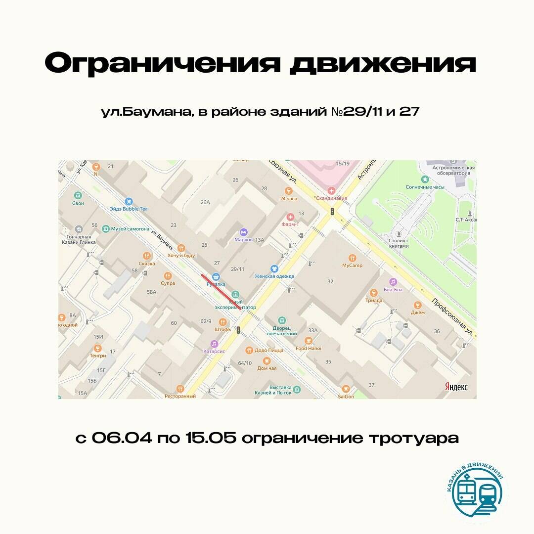 У домов №29/11 и 27 по улице Баумана, около перекрестка с улицей Астрономическая, с 6 апреля по 15 мая будет закрыт тротуар.